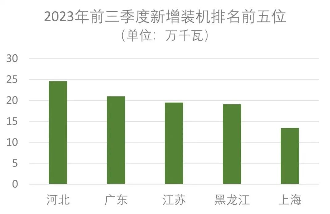 新增裝機(jī)排名前五位的省區(qū)是河北、廣東、江蘇、黑龍江和上海,分別為24.6萬(wàn)千瓦、21萬(wàn)千瓦、19.5萬(wàn)千瓦、19.1萬(wàn)千瓦和13.4萬(wàn)千瓦。