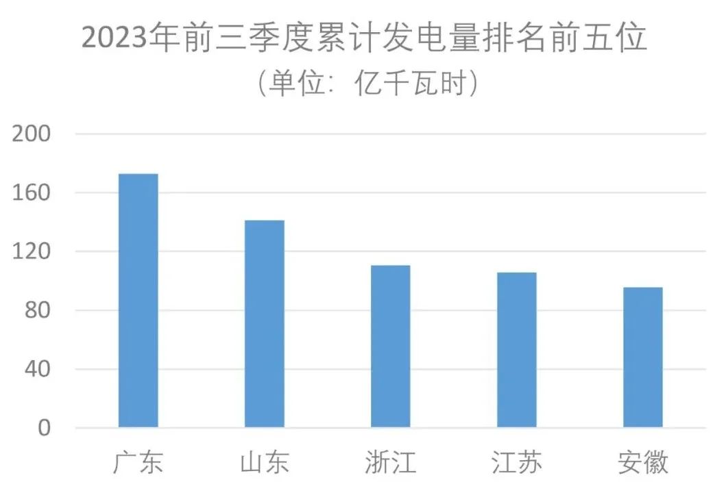今年累計(jì)發(fā)電量排名前五位的省份是廣東、山東、浙江、江蘇和安徽,分別為172.9億千瓦時(shí)、141.1億千瓦時(shí)、110.6億千瓦時(shí)、105.7億千瓦時(shí)和95.6億千瓦時(shí)。